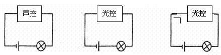 ”)。小明想利用它们设计一个电路,能自动控制楼道里的电灯:当有人走动发出声音时,电路接通,灯亮;经过一两分钟后,内部的延时装置就能把电路断开,灯灭;不过,只有夜晚天黑之后灯方能亮,白天不论发出多大的声音,电灯也会“无动于衷”。请你帮助小明画出实现上述功能的电路。