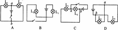 分析与解答:本题采用电流法或元件连接法都可以迅速而准确地判断四幅图的连接方式。B图,电流从电源正极出发,顺次流过L1和L2,再流回电源负极,因此B图是串联。A、C、D图,电源从电源正极流出后,在a点分成两条支路,一部分电流从一条支路通过L1,另一部分电流从另一条支路通过L2,在b点汇合后再流回电源负极,因此A、C、D图是并联。用元件法判断电路的连接方式时,不要被表象所迷惑,认为两灯并排就是并联,而要抓住实质。如b图,两灯虽然并排放置,但实际上却是首尾相连,所以是串联;A、C、D三图中,两灯看上去是顺次放置,但实际上是分别将两端连接在一起,再接入电源两极的,所以都是并联,两种判断的结果是一致的。