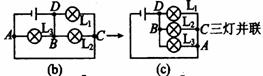 (2)(2)当开关S1、S2均闭合,如图(b),有等效法,D与B,A与C看作一点,进一步简化为(c) |