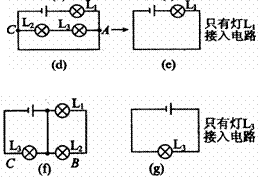 (4)当S1闭、S2开时,如图(f),电流从电源正极→B→L3→C→负极,简化如图(g) |