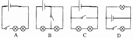 评点:本题考查开关在电路中对用电器的控制作用。A图是串联电路,当开关断开时,两灯均不发光;当开关闭合时,两灯均发光,不符合题意。C图虽然开关断开时两灯均发光,但是当开关闭合时,电源被短路,两灯均不发光,因此C也不对。D图两灯并联,支路开关只控制本支路用电器,当开关闭合时两灯均发光,当开关断开时,开关所在的支路上的灯不发光,而另一支路上的灯仍然发光,因此D也不对。根据排除法,选择正确答案B。B图中开关闭合时将一只灯短路,另一只灯仍然工作;开关断开时,两灯均能发光。开关控制用电器,应该与用电器串联还是并联,决定于题目的要求。