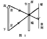 春秋战国时期,墨家学派所著《墨经》的《经下》18条记载了世界上最早的针孔成像实验:“景到(倒),在午有端,与景长,说在端”、此处“景”即影或像,“到”即倒,“午”指遮光屏,“端”即小孔.这句话的意思是,物体的影或像所以倒转,是由于屏上有一点状小孔,入射光线在孔中相交的缘故.《墨经》的《经说》还就倒像的形成机理作了说明:“景:光这人,煦(照)若射,下者之人也高;高者之人也下.足蔽下光,故成景于上;首蔽上光,故成景于下.……”意思是说光照人,人体反射后如同箭一样直进,通过针孔在屏幕上见到的人之下部在高处,人的上部在低处,其原因在于:发自足部的光线被遮去了下面部分,所以成影在上;发自头部的光线被遮去了上面部分,所以成影在下,如图1所示.