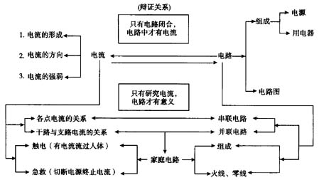 第一节课电流、电路内容齐头并进,显得知识跳跃、杂乱。但仔细分析,它体现了电流、电路的辩证关系,下面就是本章的知识网络。