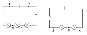 甲组:学生用电源、导线、开关和三个灯泡组成串联电路.然后在电路图1中取A、B、C、D四点分别串联电流表就可得出结论.