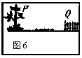 如图6所示,树上停着一只乌鸦,地上有几只小虫,那么乌鸦从树上的P点飞下来吃地上的哪一只小虫再飞到对面的篱笆墙上的Q点,它的飞行路程最短?请你根据学过的光学知识为它设计一条飞行路线,在图6中作出示意图,你所依据的物理知识是_____________________________________。