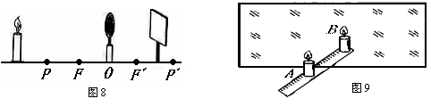 24.如图8所示,F、F '为凸透镜的焦点,P、P '是距凸透镜两倍焦距处,烛焰在光屏上所