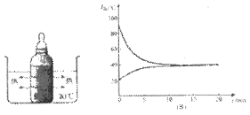 (2005重庆)小刚为了研究热传递过程中温度变化与时间的关系,他将装有热奶的奶瓶放入室温的水中,如图(A)所示。小刚每隔一定的时间记录一次水温,作出了图(B)所示的图像。请你根据图像判断,大约经过 min,热奶和水达到了热平衡,此时的水温约为 ℃。