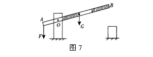 15.(2分) 图7是安装在安全文明小区进出口的栏杆(栏杆是一根粗细均匀的圆木杆)示意图,当在 A处施加一个压力F时,可将栏杆拉到如图所示位置,请在图中画出此时压力F的力臂L1,和重力G的力臂L2。