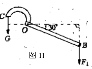 21.(7分)如图11是一台手动小水泵的示意图。当竖直向下作用在手柄OB的力F1为40N时,水泵提起一定量的水,手柄长OB=50cm,这时它与水平面夹角为300,阻力臂长OC=14cm。求: