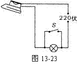 15. 普通电熨斗工作时可以看成一根电热丝,通电加热即可使用.强强同学把电熨斗串联一只“220 V 40 W”的灯泡,用来调节电熨斗的温度,方便熨烫不同衣物,如图13-23所示。电熨斗的额定电压和额定功率分别为220 V、100 W。 ??(1)用物理知识分析开关S的通断对电熨斗温度的影响; ??(2)计算在开关通断两种状态下电熨斗所消耗的电功率。