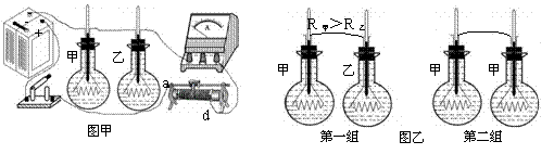 (2)选用图乙中第一组电阻来进行实验,接通电路一段时间,比较两瓶中的煤油____上升得高。我们可以推测:在通电时间相同、通过电流相等的情况下________越大放热越多。这个实验是控制_________、_________两个物理量不变,来研究___________和________两个物理量的关系。