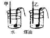 如图所示,实验室内两个相同的烧杯中装有等质量的水和煤油,用同一规格的电加热器同时加热一段时间(热量损失不计,且液体均未沸腾),则加热过程中甲乙两支温度计升高的温度之比为(C煤油=2.1×103焦/(千克·℃)) ( )