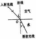 根据演示观察到的现象,教师在黑板上画出水和空气的界面,画出入射光线和折射光线,入 射点,并过入射点画出法线,标出入射角和折射角,如图所示。