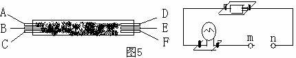 9.如图5所示,在一根横跨河流两岸的硬塑料管内穿有三根完全相同的电线,为了辨别哪两个头为同一根导线的两端,可以用图示的测通器来测试,其操作过程如下:(1)连接A和B,将测通器的m连接在D上,当n连接F时小灯泡发光,连接E时小灯泡不发光。由此可以确定 为同一导线的两端(填字母,下同)。(2)为了弄清另两根导线的两端,可连接A和C,测通器的一端必须与 相连时,另一端只需接触一根导线就能将另两根导线辨别开。