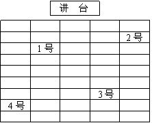 第6题. 某班教室中有9排5列座位,请根据下面四个同学的描述,在图中标出“5号”小明的位置.1号同学说:“小明在我的右后方.”2号同学说:“小明在我的左后方.”3号同学说:“小明在我的左前方.”4号同学说:“小明离1号同学和3号同学的距离一样远.”