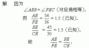 所以 △AEB∽△FEC(如果一个三角形的两条边与另一个三角形的两条边对应成比例,并且夹角相等,那么这两个三角形相似.)