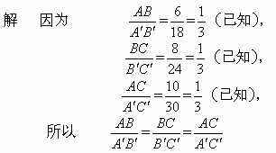 例4 在△ABC和△A′B′C′中,已知:AB=6 cm, BC=8 cm,AC=10 cm,A′B′=18 cm,B′C′=24 cm, A′C′=30 cm.试判定△ABC与△A′B′C′是否相似,并说明理由.