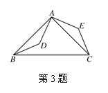 3.如图,点D是等腰直角三角形ABC内一点,AB=AC,将△ABD绕点A逆时针旋转90°,点D与点E重合,则△ABD≌_________, AD=_________, BD=_________.