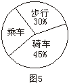 某校共有学生600名,学生上学的方式有乘车、骑车、步行三种. 如图5是该校学生乘车、骑车、步行上学人数的扇形统计图.