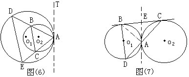 例4:如图(6),⊙o1与⊙o2内切于A,过A作大圆的弦AD、AE分别交小圆于B、C。求证:![]()