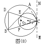 例6:如图(8),两圆内切于点C,⊙o1的弦AB切⊙o2于E,CE的延长线交⊙o1于点D,求证:![]()