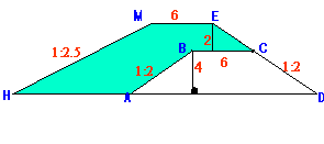 7).如图:是一海堤的横断面为梯形ABCD,已知堤顶宽BC为6m,堤高为4m,为了提高海堤的拦水能力,需要将海堤加高2m,并且保持堤顶宽度不变,迎水坡CD的坡度也不变.但是背水坡的坡度由原来的i=1:2改成i=1:2.5(有关数据在图上已注明)