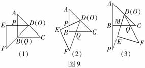 (3)在(2)的条件下,设CQ=x,两块三角板重叠面积为y,求y与x的函数关系式.(图9(2),图9(3)供解题用)