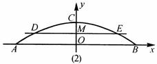 15.卢浦大桥拱形可以近似看作抛物线的一部分.在大桥截面1∶11000的比例图上,跨度AB=5 cm,拱高OC=0.9 cm,线段DE表示大桥拱内桥长,DE∥AB,如图(1).在比例图上,以直线AB为x轴,抛物线的对称轴为y轴,以1 cm作为数轴的单位长度,建立平面直角坐标系,如图(2).