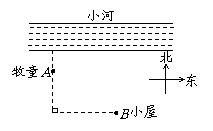 (10分)如图,一个牧童在小河的南4km的A处牧马,而他正位于他的小屋B的西8km北7km处,他想把他的马牵到小河边去饮水,然后回家.他要完成这件事情所走的最短路程是多少?