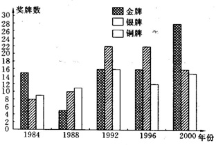 (1)从1984-2000年的5届奥运会,我国运动员共获奖牌多少枚?