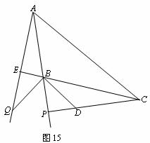 25.(12分)如图15,AE、CP分别是钝角三角形ABC(∠ABC>90°)的高,在CP上截取CD=AB,在AE的延长线上截取AQ=BC,连结BD、BQ.