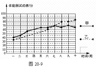 42.如图20-9是连续十周测试甲、乙两名运动员体能训练情况的折线统计图。教练组规定:体能测试成绩70分以上(包括70分)为合格。