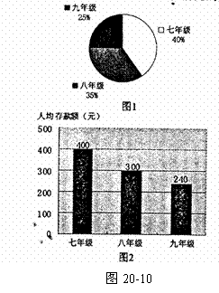 为了帮助贫困失学儿童,某团市委发起“爱心储蓄”活动,鼓励学生将自己的压岁钱和零花钱存入银行,定期一年,到期后可取回本金,而把利息捐给贫困失学儿童.某中学共有学生1200人,图20-10-1是该校各年级学生人数比例分布的扇形统计图,图20-10-2是该校学生人均存款情况的条形统计图.