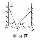 14.如图,在一个房间内有一个梯子斜靠在墙上,梯子顶端距地面的垂直距离mA为a米,此时,梯子的倾斜角为75°,如果梯子底端不动,顶端靠在对面墙上n,此时梯子顶端距地面的垂直距离nB为b米,梯子的倾斜角45°,则这间房子的宽AB是 米。