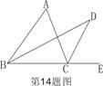 14.如图所示,△ABC中,BD、CD分别平分∠ABC和外角∠ACE,若∠D﹦240,则∠A﹦ .