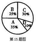 15.如图所示的扇形图是对某班学生是否知道父母生日情况的调查统计图.其中,A表示只知道父亲生日;B表示只知道母亲生日;C表示父母两人的生日都知道;D表示父母两人的生日都不知道.若该班有60名学生,则知道母亲生日的人数是 .