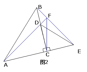 (2)当把⊿DEF绕点C旋转到如图2所示的位置时(D点在BC上),连结AD并延长交BE于点F,连结FC,则