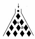 (6分)一台名为帕斯卡三角的仪器,如图所示,当一实心小球从入口落下,它在依次碰到每层菱形挡块时,会可能地向左或向右落下。试问小球通过第二层A位置的概率是多少?第三层B位置的概率是多少?