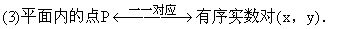 引出: 对于坐标平面内任意一点,有唯一的一对有序实数与它对应;对于任意一对有序实数,坐标平面内有唯一的一点与它对应。也就是说,坐标平面内的点与有序实数对是-一对应的