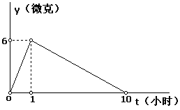 在全国抗击“非碘”的斗争中,某市研究所的医学专家们经过日夜奋战,终于研制出一种治疗非典型肺炎的抗生素,据临床观察:如果成人按规定的剂量注射这种抗生素,注射药液后每毫升血液中的含药量y(微克)与时间t(小时)之间的关系近似地满足下图所示的折线: