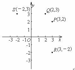 例1 在上图中分别描出坐标是(2,3)、(-2,3)、(3,-2)的点Q、S、R,Q(2,3)与P(3,2)是同一点吗?S(-2,3)与R(3,-2)是同一点吗?解