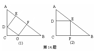14.有一块两直角边长分别为3cm和4cm的直角三角形铁皮,要利用它来裁剪一个正方形,有两种方法:一种是正方形的一边在直角三角形的斜边上,另两个顶点在两条直角边上,如图(1);另一种是一组邻边在直角三角形的两直角边上,另一个顶点在斜边上,如图(2).两种情形下正方形的面积哪个大?