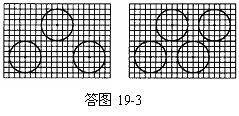 摆放三套或四套的设计方案如图19-3所示.关键是确定这些 圆的圆心位置(圆心分别在等腰三角形和平行四边形的顶点处),另外,设计的示意图要符合比例要求:(1)每个圆的半径为1.5㎝;(2)每个圆的圆心到方格纸外边框的距离不小于2㎝;(3)设计两圆的圆心的距离不小于3.5㎝.