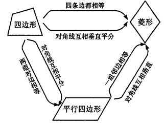 (引导学生归纳总结菱形的判定方法,通过课件演示逐渐得出下表.让学生从图形的变化中形象地看到被判定图形是四边形还是平行四边形,它们各要具备什么条件才是菱形,从中领悟到各种图形之间的内在联系).