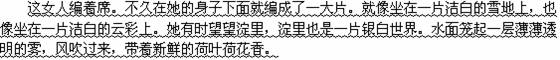 要问白洋淀有多少苇地?不知道。每年出多少苇子?不知道。只晓得,每年芦花飘飞苇叶黄的时候,全淀的芦苇收割,垛起垛来,在白洋淀周围的广场上,就成了一条苇子的长城。女人们,在场里、院里编着席。编成了多少席?六月里,淀水涨满,有无数的船只运输银白雪亮的席子出口,不久,各地的城市村庄,就全有了花纹又密又精致的席子了。大家争着买: