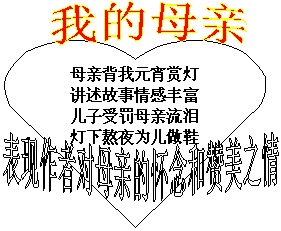 (为突出板书简洁、清楚、明了的特点,力求图文并茂,并对学生有所启迪和思考,我采用一个“心”字形,这不仅体现了母亲抚育一颗生命的含辛茹苦,更蕴含着母亲在儿女生命发展过程中潜移默化、润物无声的影响,从而激发学生热爱自己的母亲。)