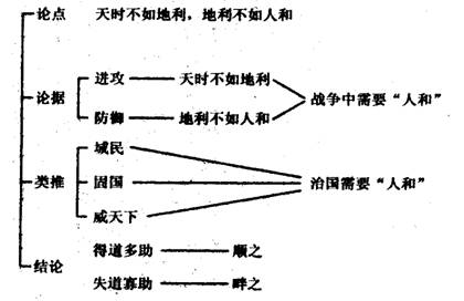 文章开籍提出论点,指出人和是克敌制胜的首要条件,由此逐层展开,用概括性的战例加以证明,分别就天时与地利、地利与人和作比较,指出天时、地利、人和三因素在战争中所起的作用不同,然后由战争中的“人和”推出治国安邦的道理,得出“得道多助,失道寡助”的结论,阐明了“人和”的实质,即“多助”天下顺之”;最后把“多助”与“寡助”进行对比,自然导出“君子有不战,战必胜矣”。