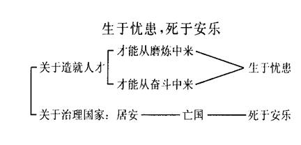 作者从个人、国家两方面论证。文章先谈造就人才的问题。先以六个出身低微、经过种种磨炼而终于身负“大任”的显贵人物为例来说明人才是在艰苦环境中造就的,同时又重视人的主观因素,提出“困于心,衡于虑,而后作”的观点。从两方面说明人要有所作为,成就大业,就必须在生活、思想、行为等方面经受一番艰难甚至痛苦的磨炼。接着由个人说到国家,指出决定国家存亡的因素和个人能否成就大业的因素相仿,最后推出论点。