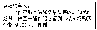 某宾馆客房的床上摆了一件叠得整整齐齐的浴衣,浴衣上有张小纸条: