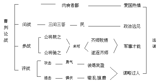本段末句“战则请从”,不仅写出了曹刿重视战前的政治准备,而且注意实际作战中的战略战术。文章也以此作为过渡,转入下文写他临阵参战指挥。